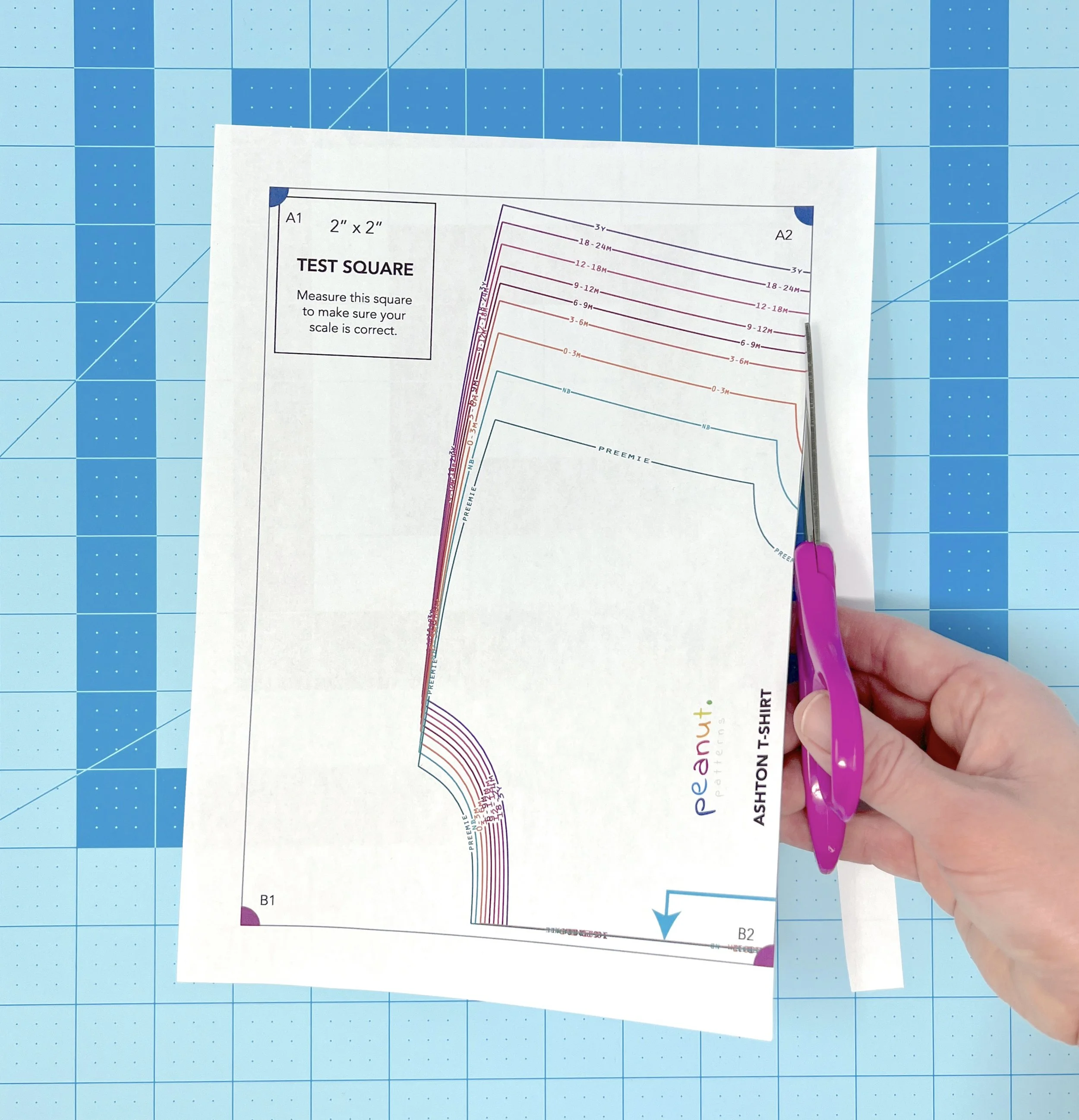 After verifying the test square measures 2″ x 2″, cut out each rectangle on every printed sheet. If your test square is not correct, stop and reprint. A test square that is even a little bit off, such as 2 ¼”, will result in a finished garment that is a couple sizes too big.